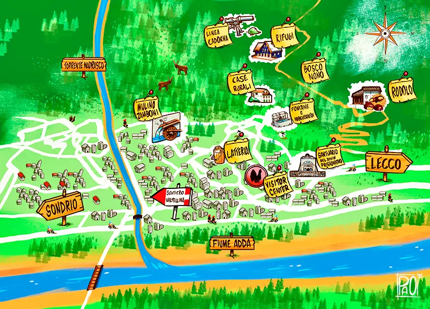 Tra i suoi simboli più significativi spicca il Santuario del Divin Prigioniero, edificato tra il 1920 e il 1923 e dedicato ai caduti e ai prigionieri di tutte le guerre. La prima pietra venne posata l’11 luglio 1920 e il 27 settembre 1925 fu celebrata la solenne inaugurazione. Nel 1929 iniziarono i lavori di rifinitura e il 16 aprile 1935 il Santuario fu consacrato dal Vescovo di Como, Mons. Alfredo Macchi, che in seguito lo proclamò “Santuario Eucaristico della Valtellina”. Oggi questo luogo è non solo memoria e spiritualità, ma anche chiesa parrocchiale della frazione di Valle e cuore dell’Opera fondata da don Giovanni Folci, figura di grande rilievo per la comunità locale.
